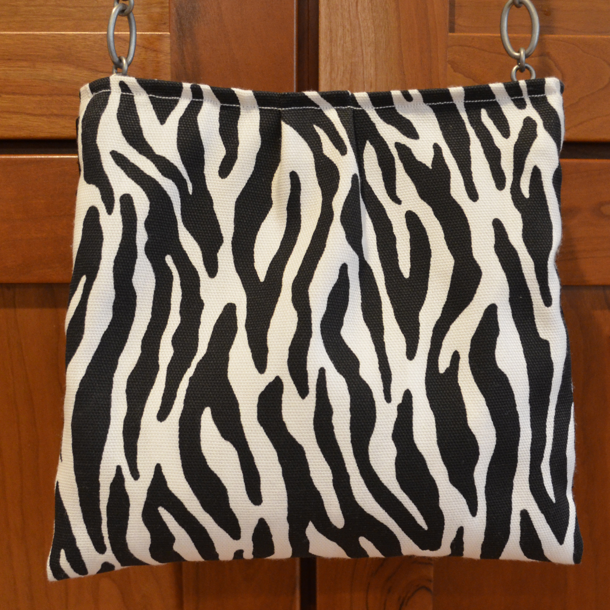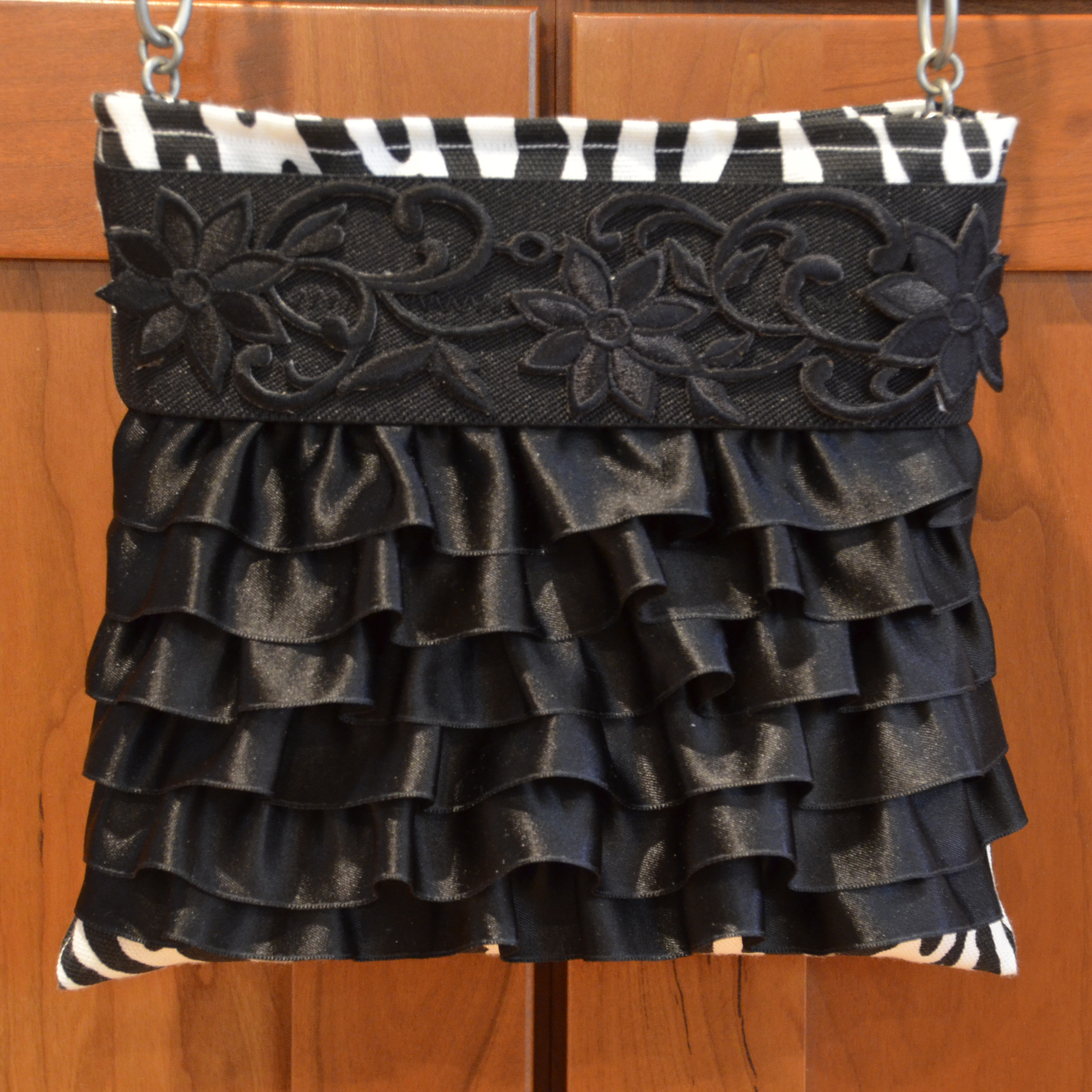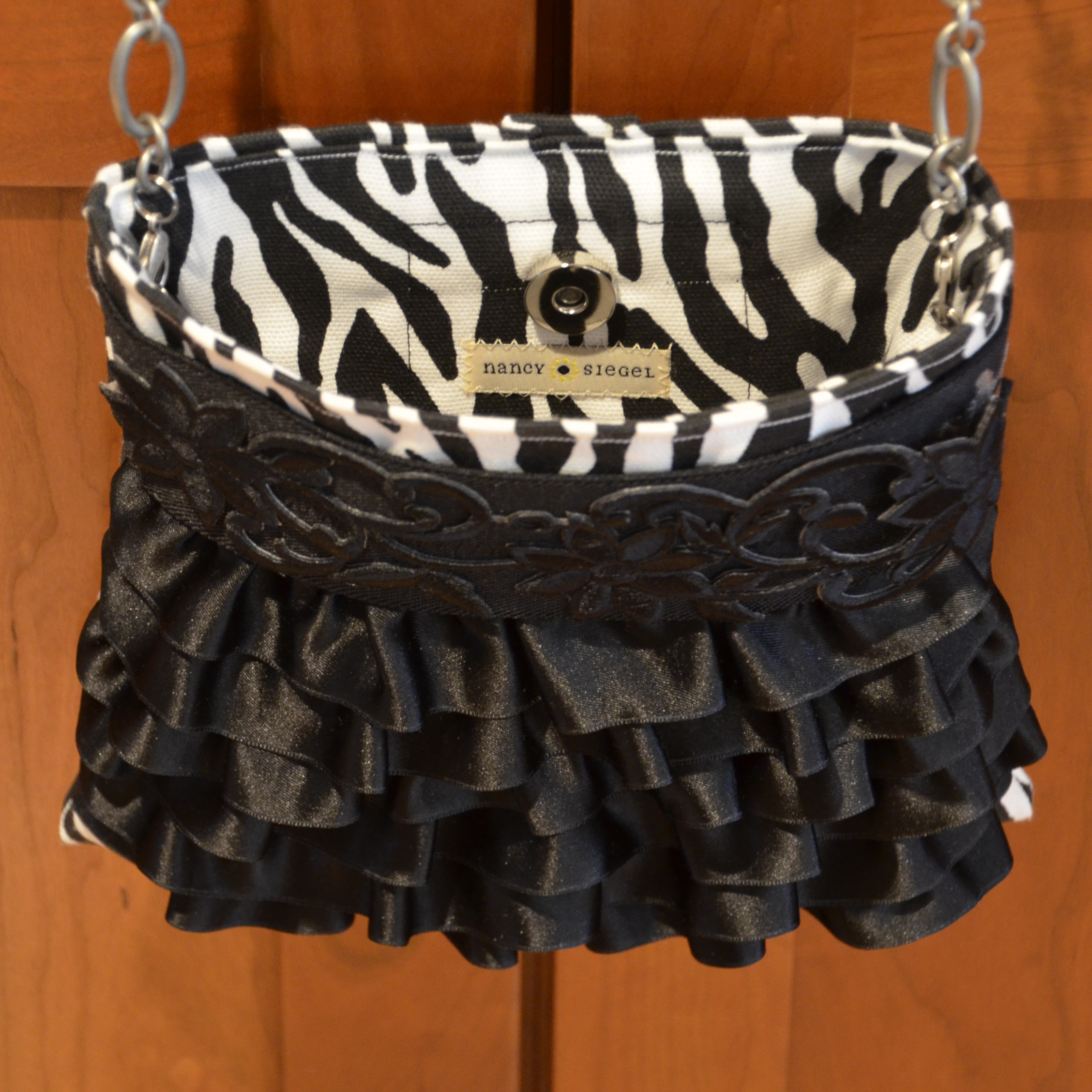 Although this bag has been sold, I can create one for you that will be in keeping with it's original design. However, no two designs are identical and every bag is original, and unique, and therefore won't be duplicated exactly. Please email me and we can talk about what you'd like to have that's similar to this design.Black and white print purse measures 8"W x 7 3/4"H with black ruffles and a silver tone chain strap. The body of the bag - inside and out - is a cotton print "zebra-like" pattern. The front of the bag has layers of black satin ruffle and is topped with a wide black band with a floral appliqué. The bag drops about 21" on a silver tone removable strap, turning the bag into a clutch!In addition, the strap isremovable, allowing the bag to be carried as a clutch.For additional information