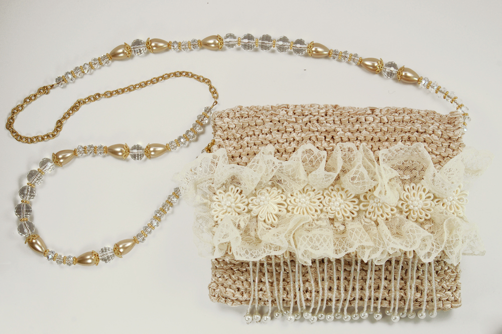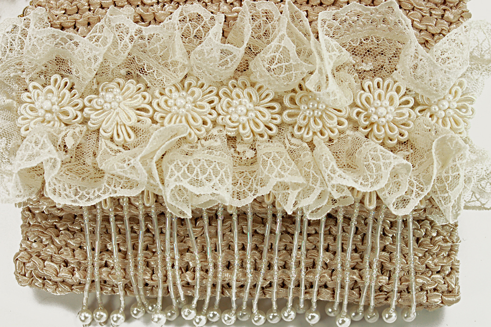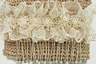 of a pale beige shimmering ribbon yarn. The flap is adorned with long strands of white pearlized beads and a row of very soft and feminine lace ruffle with a row of ivory woven flowers down the center of the ruffle.