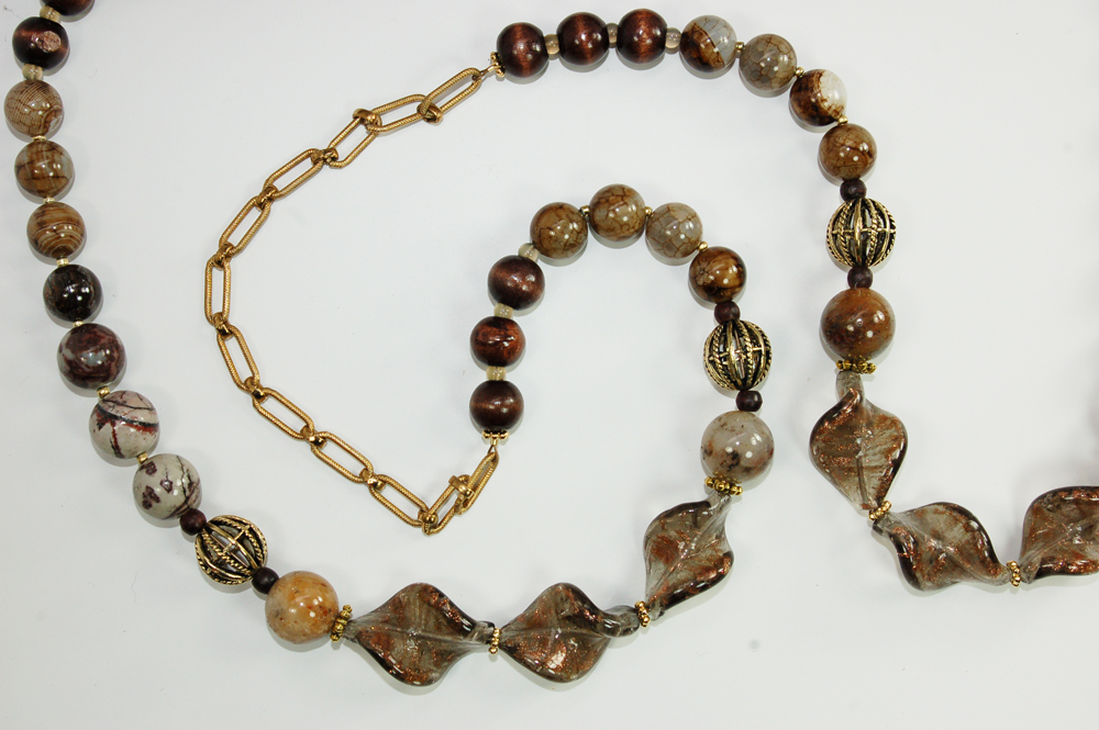 The strap is about 40" long and is hand-beaded with brown, glass and gold tone beads.A gold-tone chain rests comfortably on the shoulder.