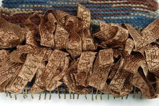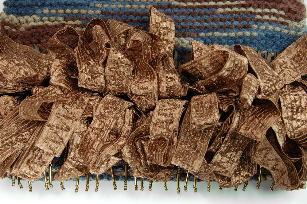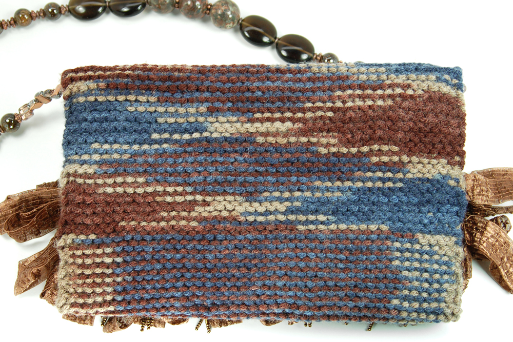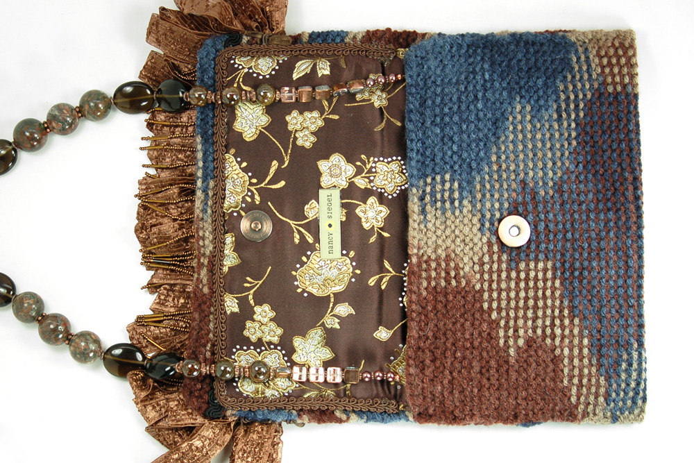 Cocoa Silk measures 8.75"W X 6"H. It is created with soft yarn in multiple tones of brown, blue and beige. The embellishment on the top flap consists of a layer of very soft brown silky ruffle that is topped with a flat brown satin trim. Hanging just below the ruffle is a row of long strands of bronze beads.The interior of the bag is lined with a soft brown and gold fabric that coordinates beautifully with the body of the purse.The strap is 34" long. It is designed with