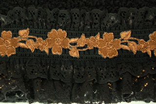 trimmed in a row of black lace, topped with a wide black lace band that straddles a row of embroidered copper flowers and leaves. Below the row of black lace hang long gold and black beads.