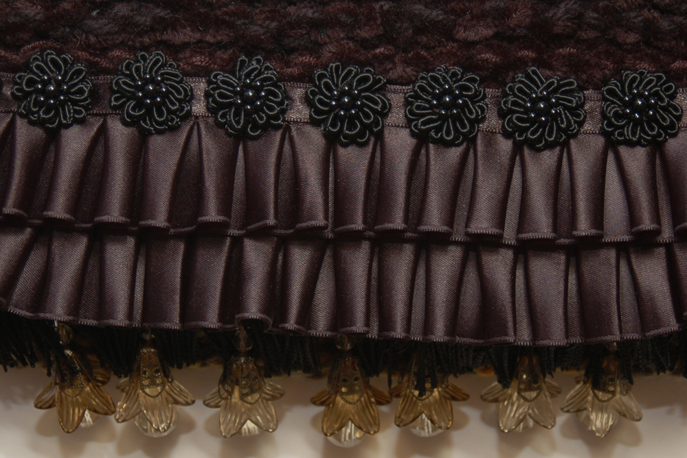 The flap of the purses is constructed of soft black chenille yarn. The embellishment on the top flap consists of a row of black fringe, a double row of black satin ruffle, which is topped with a fow of black carnations. The carnations have black beaded centers. Hanging beads, topped with dark green metallic caps hang below the fringe.