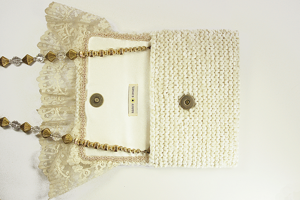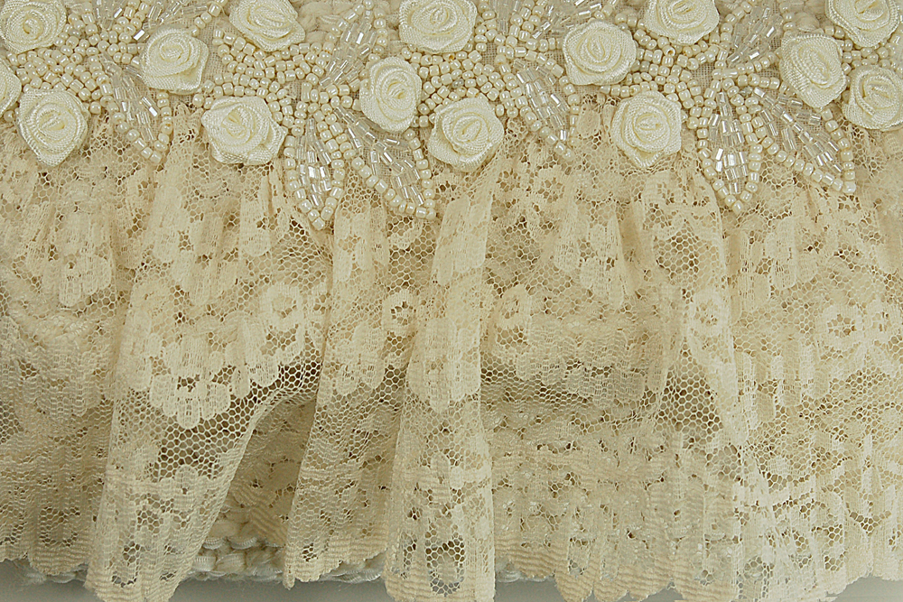 Ivory Lace measures 7"W X 5"H. It is created with a very soft ivory yarn in combination with a white ribbon yarn. The embellishment on the top flap consists of a row of wide ivory lace that is topped with a row of beautiful beaded trim dotted with soft ivory miniature roses.The interior of the bag is lined with a soft white satin fabric that coordinates beautifully with the body of the purse.The strap is 37" long. It is designed with