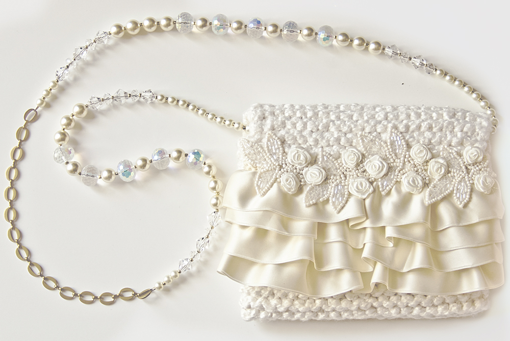 Matrimonial Ruffle measures 6.25"W X 5.25"H. It is created with a very soft textured ivory yarn. The embellishment on the top flap consists of a 4 rows of ivory satin ruffle that is topped with a row of beautiful beaded trim dotted with soft ivory miniature roses.The interior of the bag is lined with a soft white satin fabric that coordinates beautifully with the body of the purse.The strap is 37" long. It is designed with varying sizes of faceted glass beads and pearls. A gold-colored chain allows the purse to rest comfortably on the shoulder. In addition, the strap is removable, allowing the bag to be carried as a clutch. The purse has a magnetic snap closure.For additional information about Matrimonial Ruffle, please email me. I'd love to hear from you!nancy@nancysiegelpurses.com |