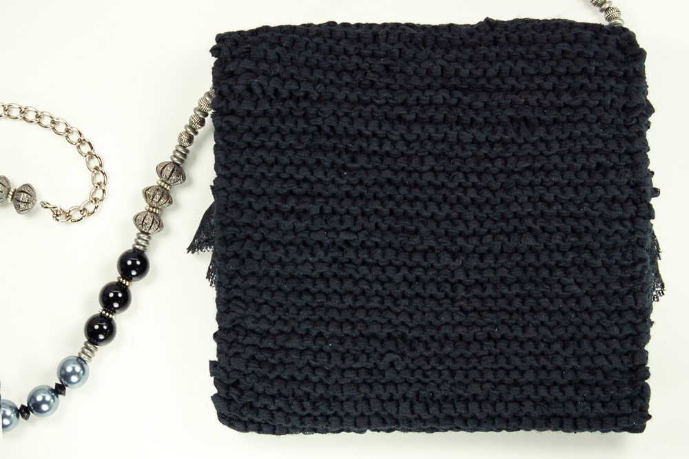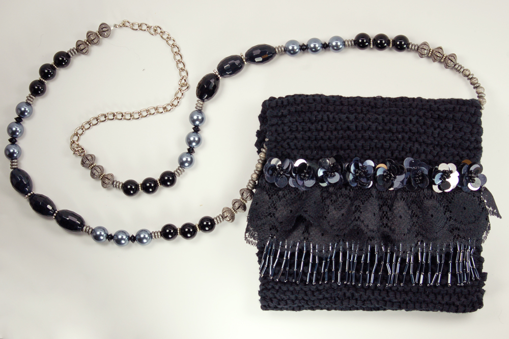 Metallic Night measures 6"W X 5.75"H. It is created with a black ribbon yarn. The embellishment on the top flap consists of a row of hanging black metallic tube beads that is topped with a beautiful black woven trim. Following is a double row of black lace ruffle. Finally, the top row consists of black sequin flowers.The interior of the bag is lined with a soft black and silver patterned fabric that coordinates beautifully with the body of the purse.The strap is 37" long. It is designed with