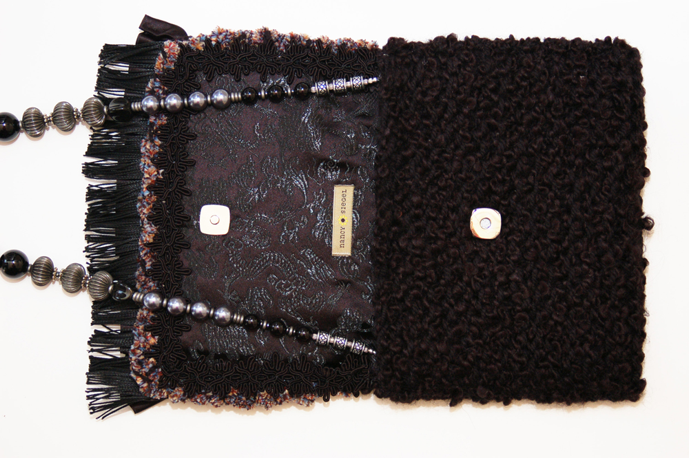 The body of the purse is constructed from a very soft black textured yarn, while the flap of the purse is a soft chenille yarn of multiple shades of blue, red and tan. The embellishment on the top flap consists of a row of black fringe, topped with a row of black satin ruffle and the finally topped with two rows of embroidered gunmetal colored flowers with patches of hematite