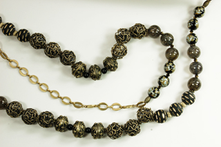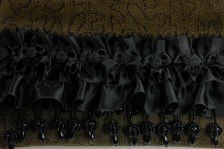 Ruffled Moss measures 8.5"W X 6.5"H.Maybe not such an attractive name (Moss) for such a beautiful purse but it truly describes the color! It is constructed of a soft green fabric - like a chenille, with a loose "squiggly" pattern almost "etched" into the fabric surface. And although the fabric is soft, the bag is lined with a fairly structured interfacing that allows the purse to maintain it's shape. The flap is adorned with a row of black hanging beads that is topped with a black satin piquot gathered ruffle. Black miniature satin bows dot the center of the ruffled row.The inside of the bag is fully lined with a deep green patterned fabric and is edged with a black woven trim.The strap is about 40" long and is hand-beaded with marbelized glass beads, cloisenne influenced black beads, as well as various brass colored beads. A gold-tone chain rests comfortably on the shoulder.In addition, the strap is removable so the purse can be carried as a clutch. |