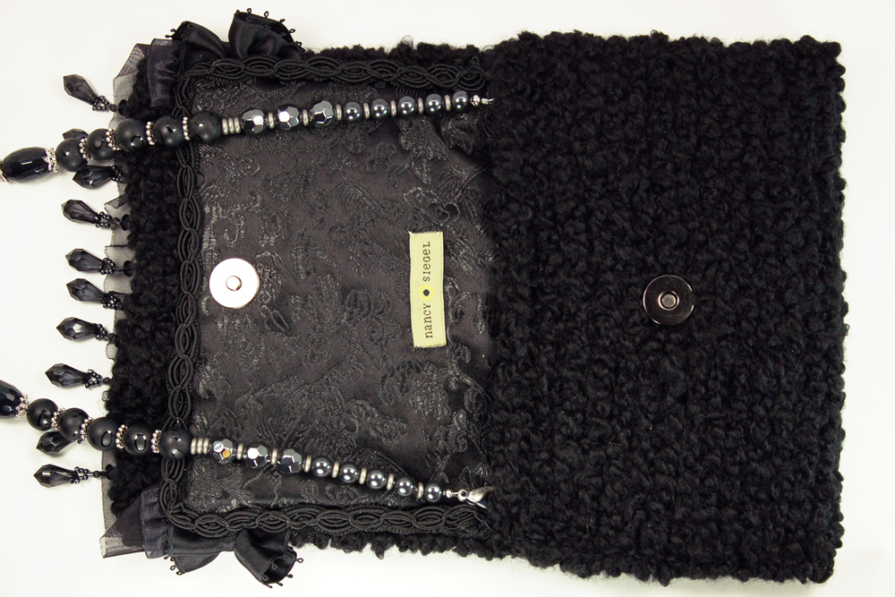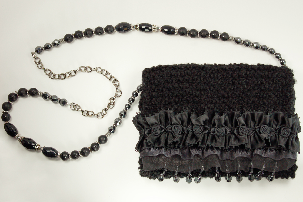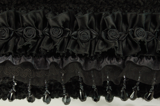 Ruffled Rose measures 7.5"W X 6"H. It is created with a very soft black textured yarn. The embellishment on the top flap consists of a row of hanging black tear drop beads that is topped with a black trim. Following is a double row of organza and satin ruffle. The top row is a puckered black satin ruffle, dotted with black satin rosettes.
