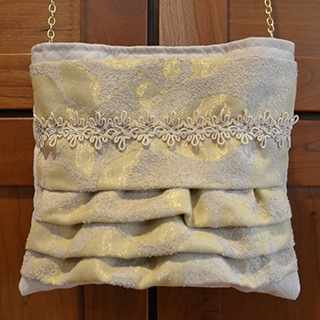 This purse is soft and feminine. The bag measures 8"W x 7 3/4"H. The body of the purse is a diamond patterned cream-colored cotton fabric and the lining is the same fabric. The front ruffle is a very pale yellow leaf pattern on a soft nubby textured fabric. There is a cream trim that spans the front width of the bag, just below the top. The bag has a 17 1/2" drop on a removable golden chain.For additional information