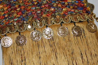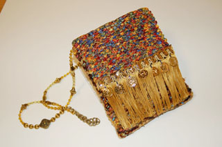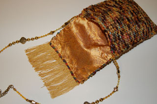 silk yarns, giving it an extremely interesting texture. The edge on the top flap is multi-layered with a long gold fringe, a braided trim, and a single layer of