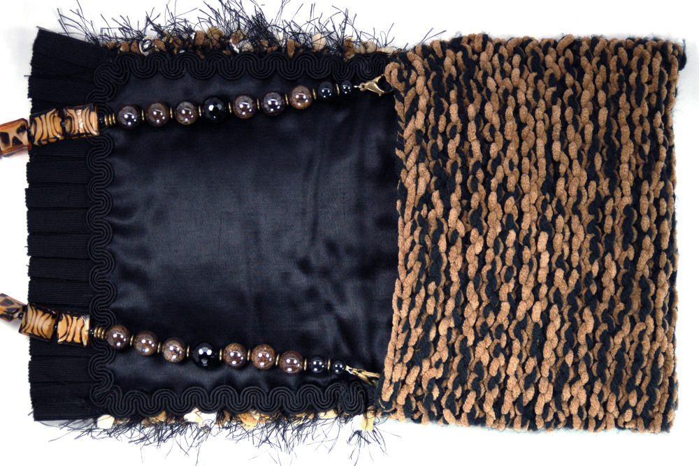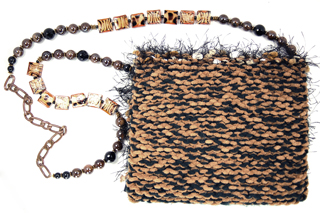 The body of the bag is crafted of two different yarns; a smooth black wool and a smooth camel colored suede-like yarn. The flap is fabricated with a black eyelash yarn and a very nubby, yet soft, camel, cream and black yarn. The edge of the flap is trimmed with a black pleated ruffle and edged with a strand of translucent gold tear drop beads. Finally, for an additional feminine touch, the flap is topped with a black daisy trim.
